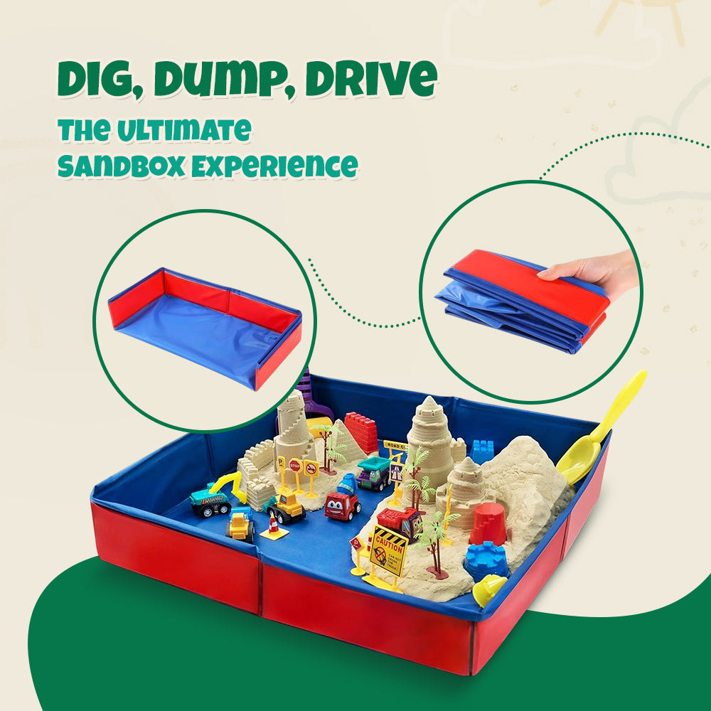 Stored flat, the included sandbox opens into a durable rectangular play space with raised edges to contain the sand. Reinforced seams maintain shape during use, preventing collapse while trucks and tools are in motion. Once play concludes, the box folds back down in seconds, helping with quick cleanup and minimal mess. Designed for portability and reuse, it supports organized sessions in different settings. Whether at home or on the move, this setup solves the problem of sand containment without needing additional trays or surfaces.