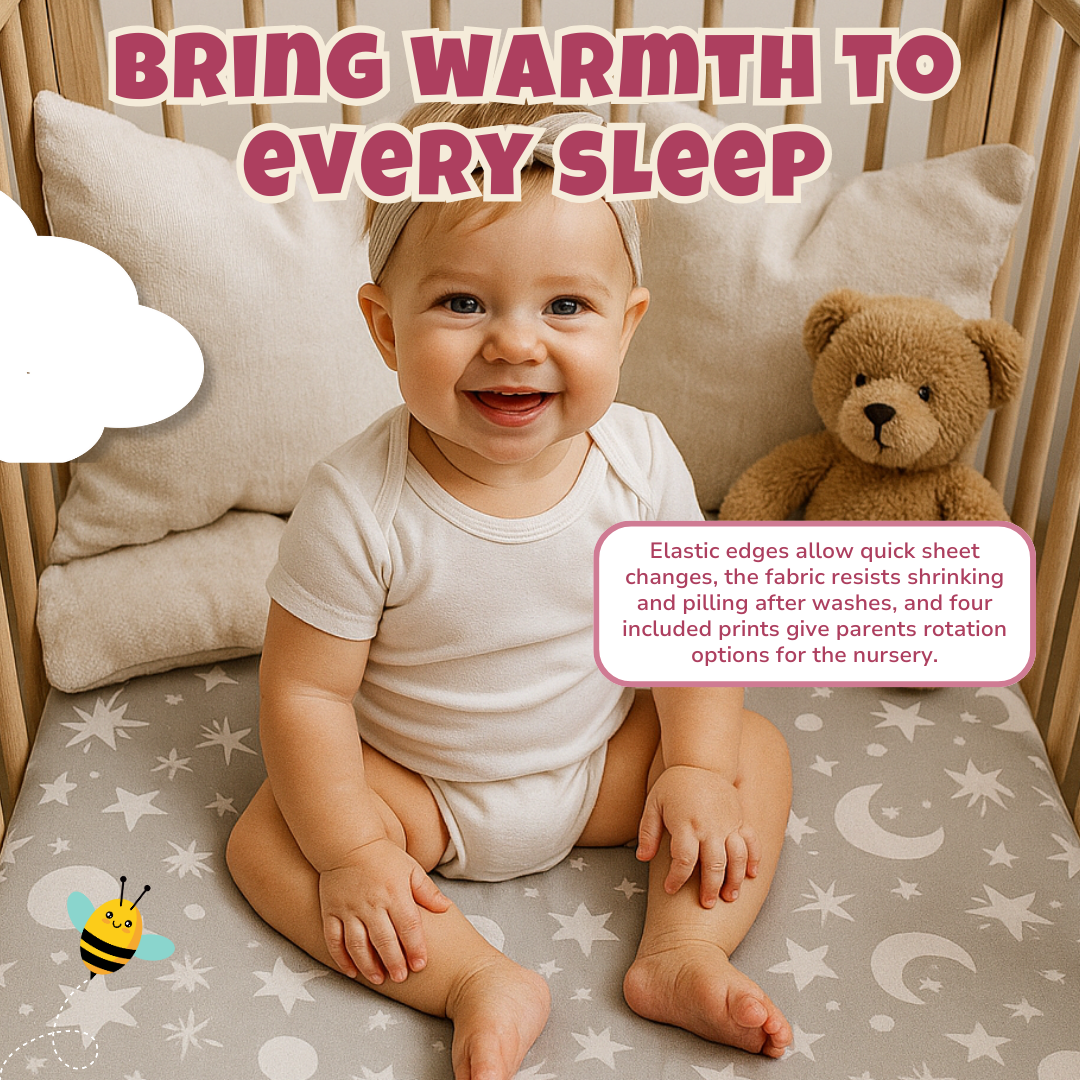 Crafted to fit standard crib and toddler mattresses, each sheet measures 52 × 28 inches with an 8-inch pocket depth. Elastic stitched along the entire edge provides a tight stretch that keeps the sheet in place without slipping or bunching. Built for repeated changes, it maintains a neat fit through regular use and washing. The flexible fabric allows smooth tucking and easy removal during sheet changes. Designed for frequent use, it withstands adjustments without losing shape.