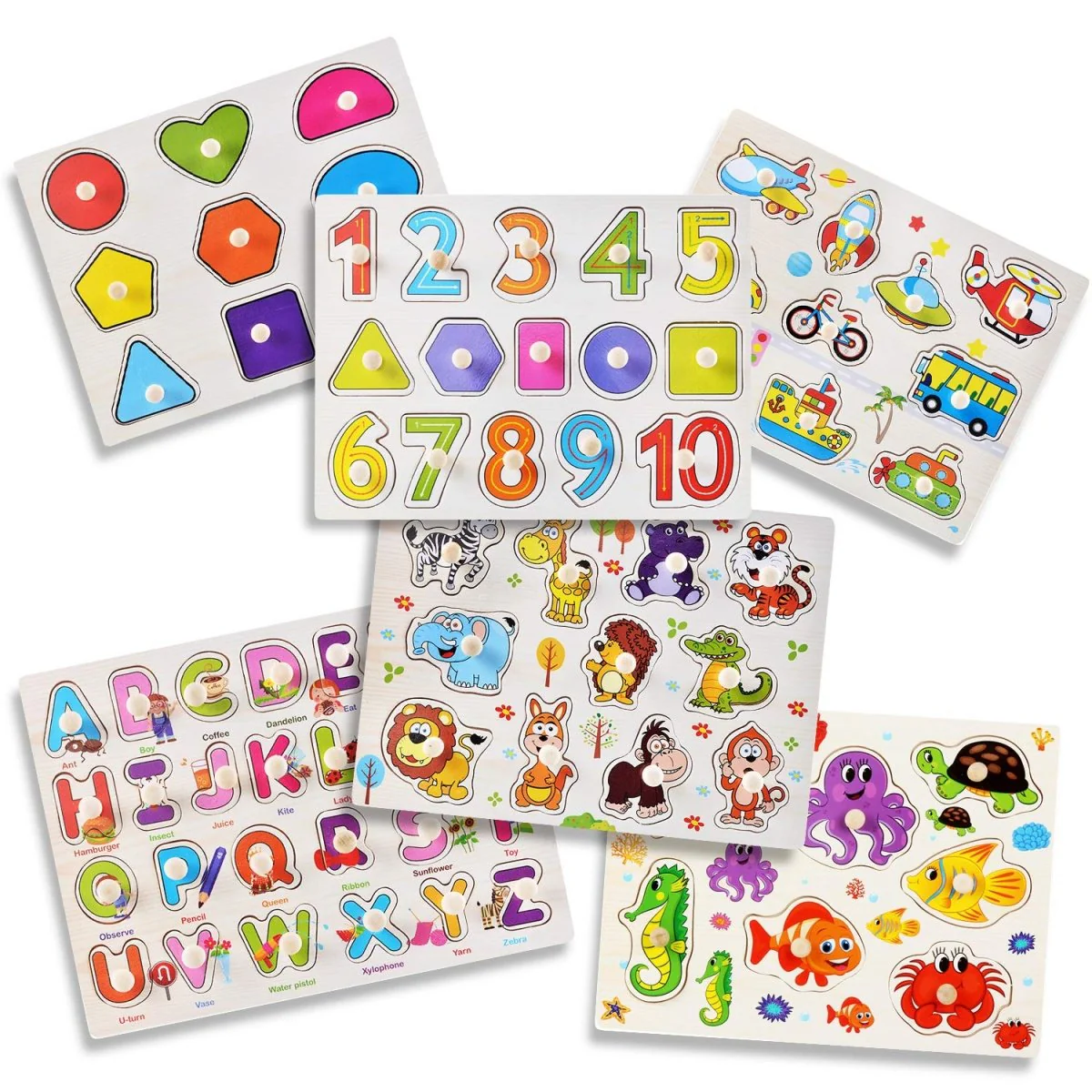 This set includes six pegboard puzzles, each focusing on a different learning area. Letters and numbers introduce basic literacy and math, while the shape puzzle strengthens spatial reasoning. The animal and vehicle boards develop object recognition, making learning more engaging. Each piece features smooth edges for comfortable handling, and the peg design allows for an easy grip. Designed with precise cutouts, the pieces fit snugly in place, preventing frustration. Bright colors and clear illustrations make identification simple. Whether matching numbers, arranging letters, or exploring new shapes, these puzzles provide a structured approach to early education.