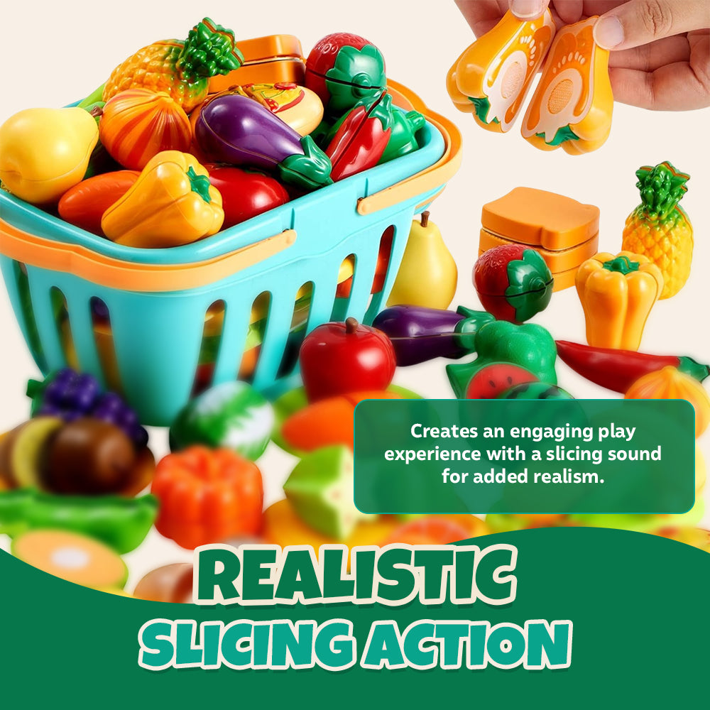 Packed with 71 total pieces, the set includes 36 cuttable food items that separate into segments using embedded Velcro. Designed for interactive slicing, each piece clicks back into place, allowing repeated use without wear. The knife is molded for toddler grip, while the mini dishes and utensils bring realism to pretend play. A compact storage basket organizes everything efficiently. Paired with bright color variation across fruits and vegetables, this toy stimulates early object recognition without relying on complicated mechanisms or electronics.