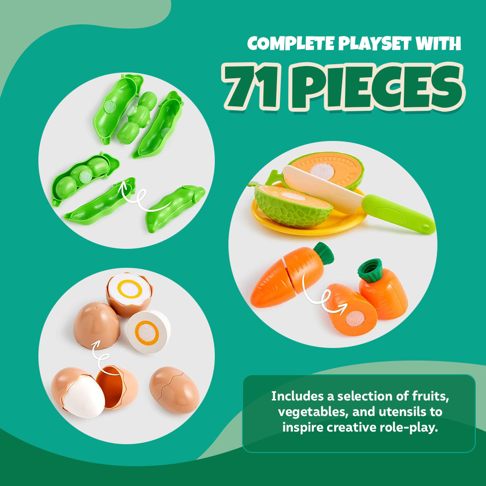 - 71 pieces including utensils: Offers a complete set with a variety of fruits, vegetables, and utensils for full play experience.