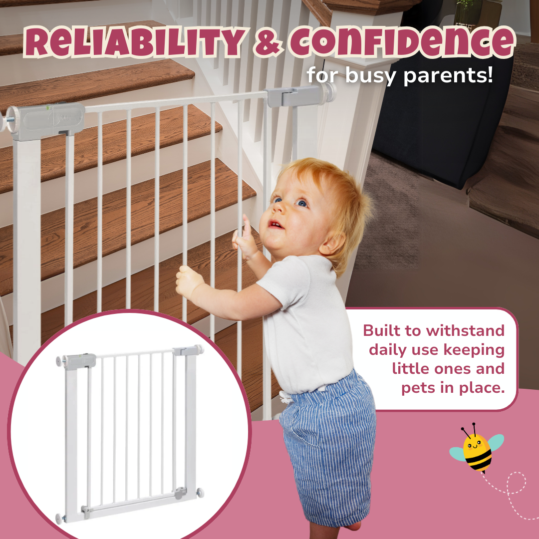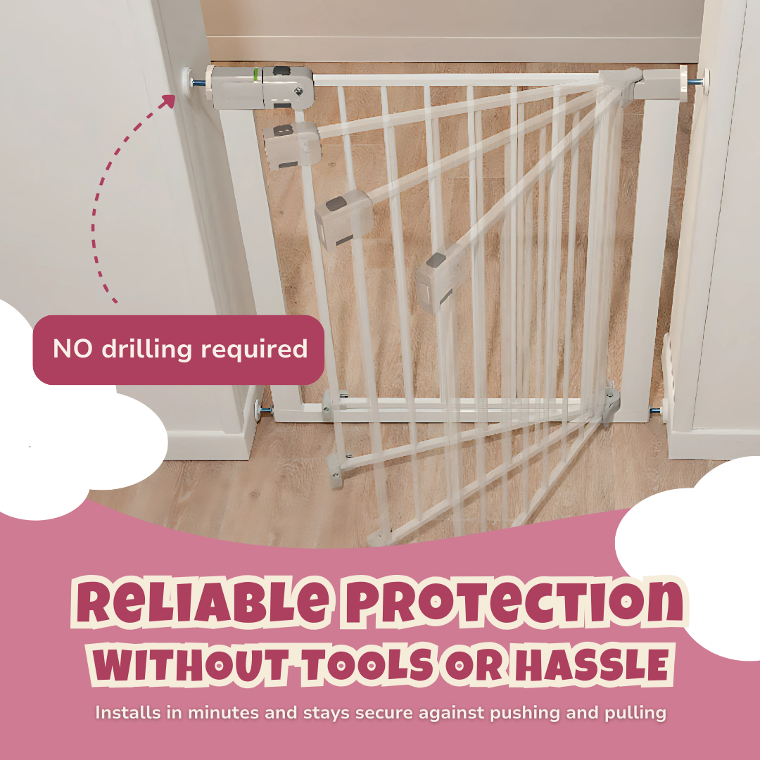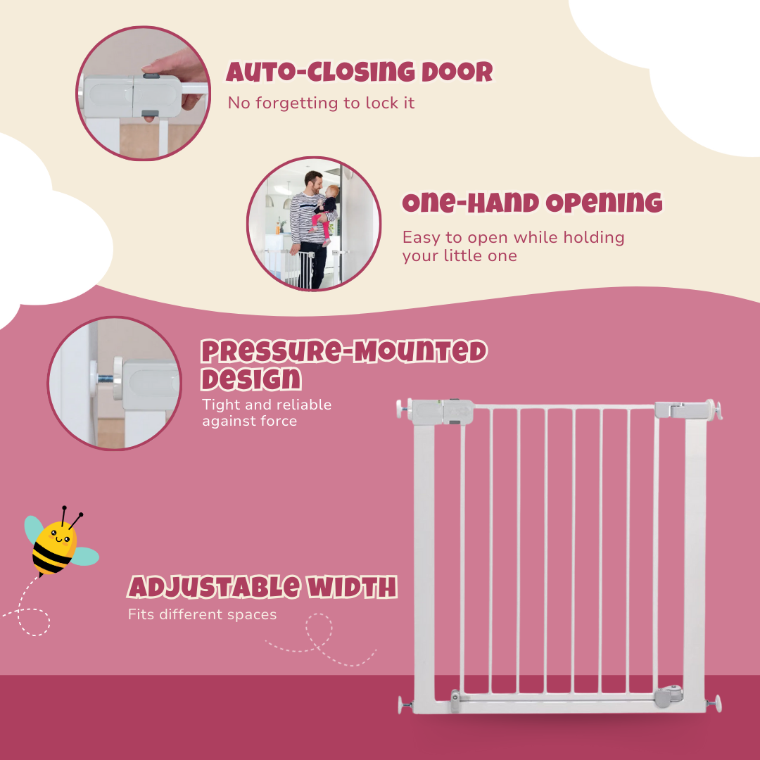 Fitted with an automatic closing mechanism, this baby gate locks itself once released, removing the need for manual latching. A secure double-lock system keeps the gate firmly shut, preventing unintended openings. Designed for doorways and staircases between 28.7 and 31.5 inches, it extends up to 53.5 inches with separate add-ons. No tools are required for installation, as pressure mounting ensures a stable hold without drilling. Built with a reinforced steel frame, it stands strong against impacts while remaining lightweight for easy handling. The gate opens in both directions, providing convenience for high-traffic areas. A stay-open function allows hands-free access when needed, making it ideal for daily household movement.