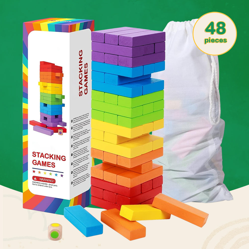 Stacking precisely cut wooden blocks, players create a tower that grows taller with every move. Each of the 48 pieces, painted in six distinct colors, fits seamlessly to maintain balance. Rolling the included dice determines which color must be removed next. Built with uniform dimensions, the blocks ensure stability while challenging coordination. A single misplaced piece can send everything toppling. The game comes with an efficient storage box that doubles as a tower builder, keeping setup and cleanup quick. Measuring approximately 9 inches in height, the structure remains manageable even for young players. The die, carved from the same wood, introduces an element of unpredictability to every round.