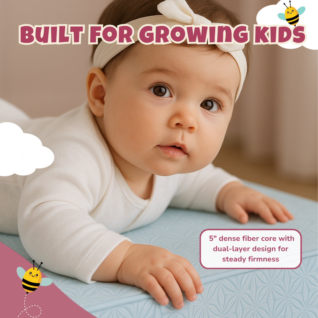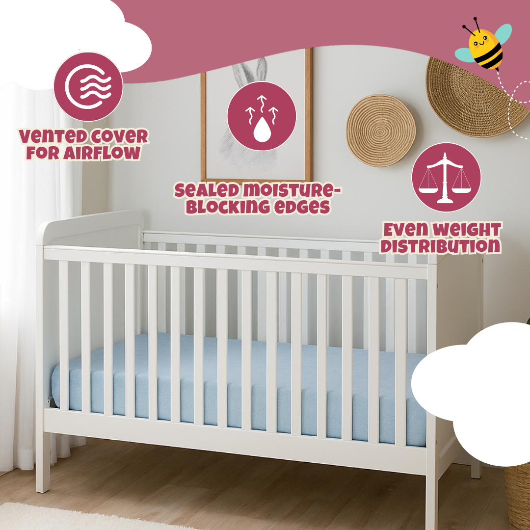 The firm construction minimizes sagging, helping maintain an even sleep surface. At just 8 lbs, it is lightweight enough for parents to lift, rotate, and handle easily while still maintaining durability. The tightly bonded layers are designed to prevent shifting inside the core, keeping the surface stable through repeated use.