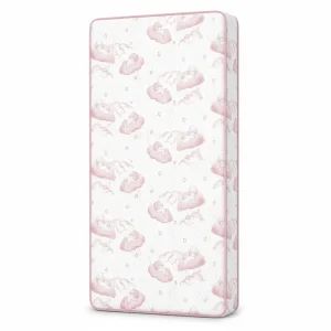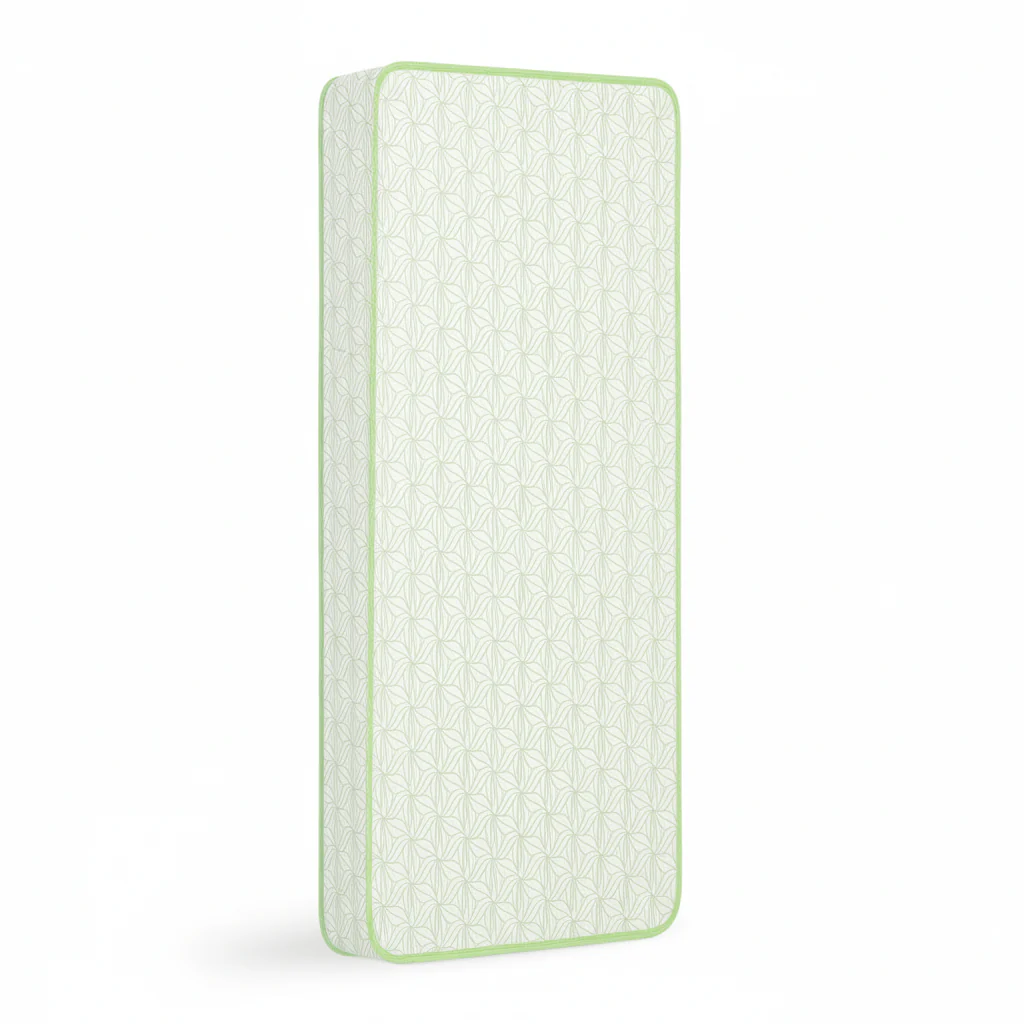 The waterproof, vented vinyl cover keeps liquids out while allowing air to circulate within the core. Spills and stains can be wiped clean using mild soap and warm water, followed by air drying before reuse. The sealed edges prevent moisture from seeping into the interior, helping the mattress maintain hygiene over time. Available in multiple designs and colors, the outer finish blends easily into different nursery setups. The venting system also reduces trapped heat, maintaining balance within the mattress layers.