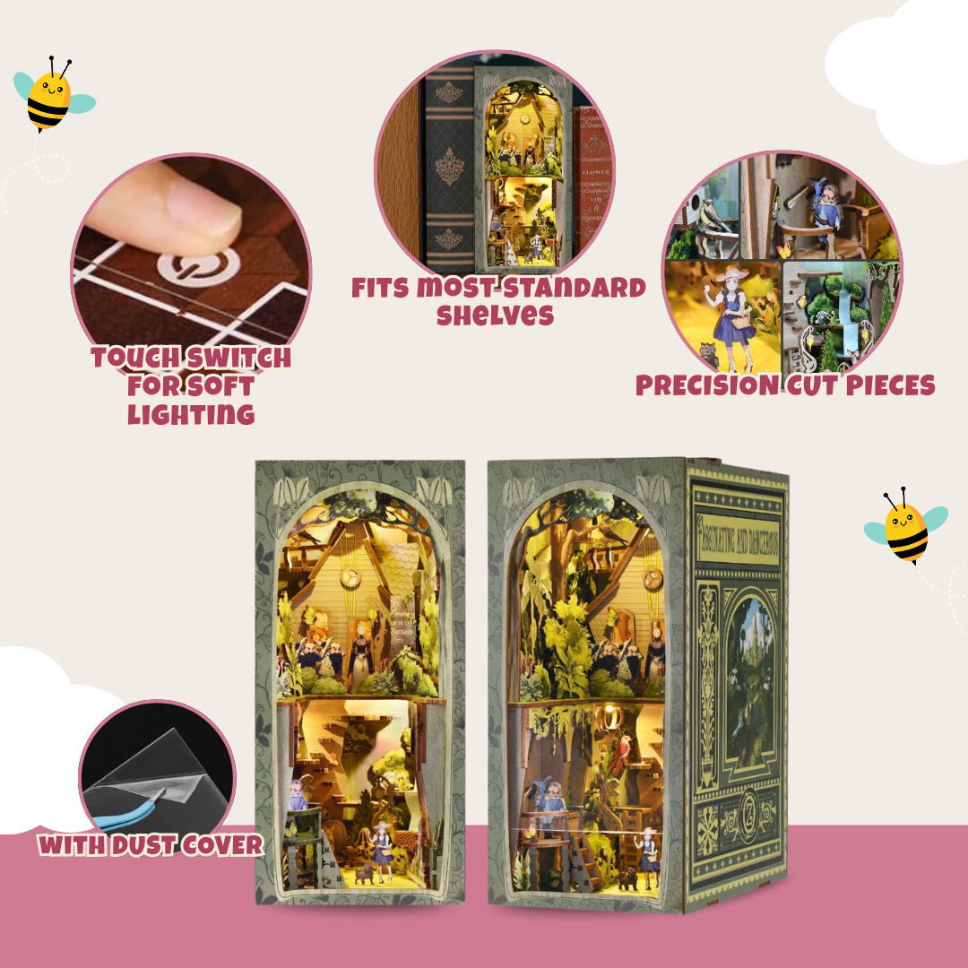 Choose between two distinct themes: the tranquil charm of a library or the whimsical adventure of Dorothy’s journey. Each kit includes unique, pre-painted details that set the scene. From tiny spines of classic novels to intricate props that evoke beloved tales, these booknooks capture your favorite stories in three dimensions. The library version features a warm, cozy aesthetic, while Dorothy’s theme brings bright, cheerful elements. No matter your preference, the kit provides everything needed to bring these delightful literary scenes to life.