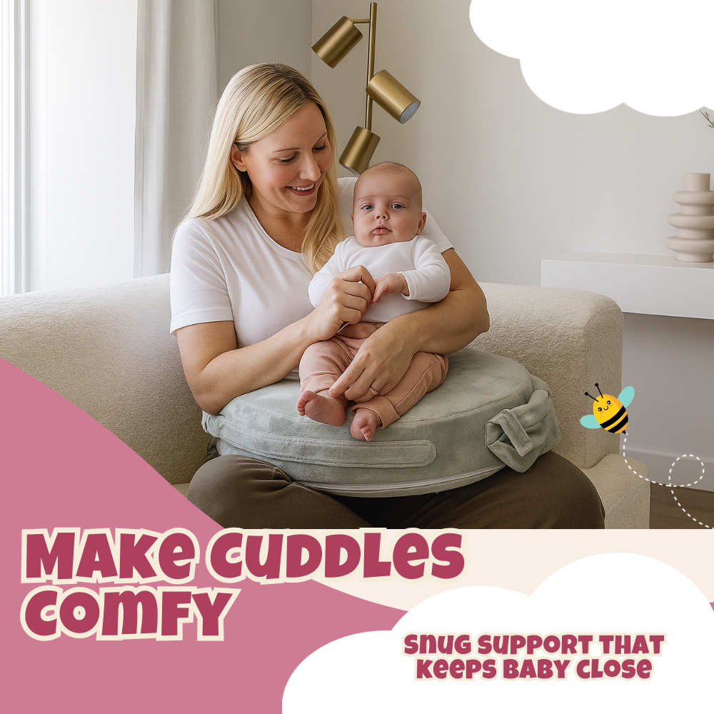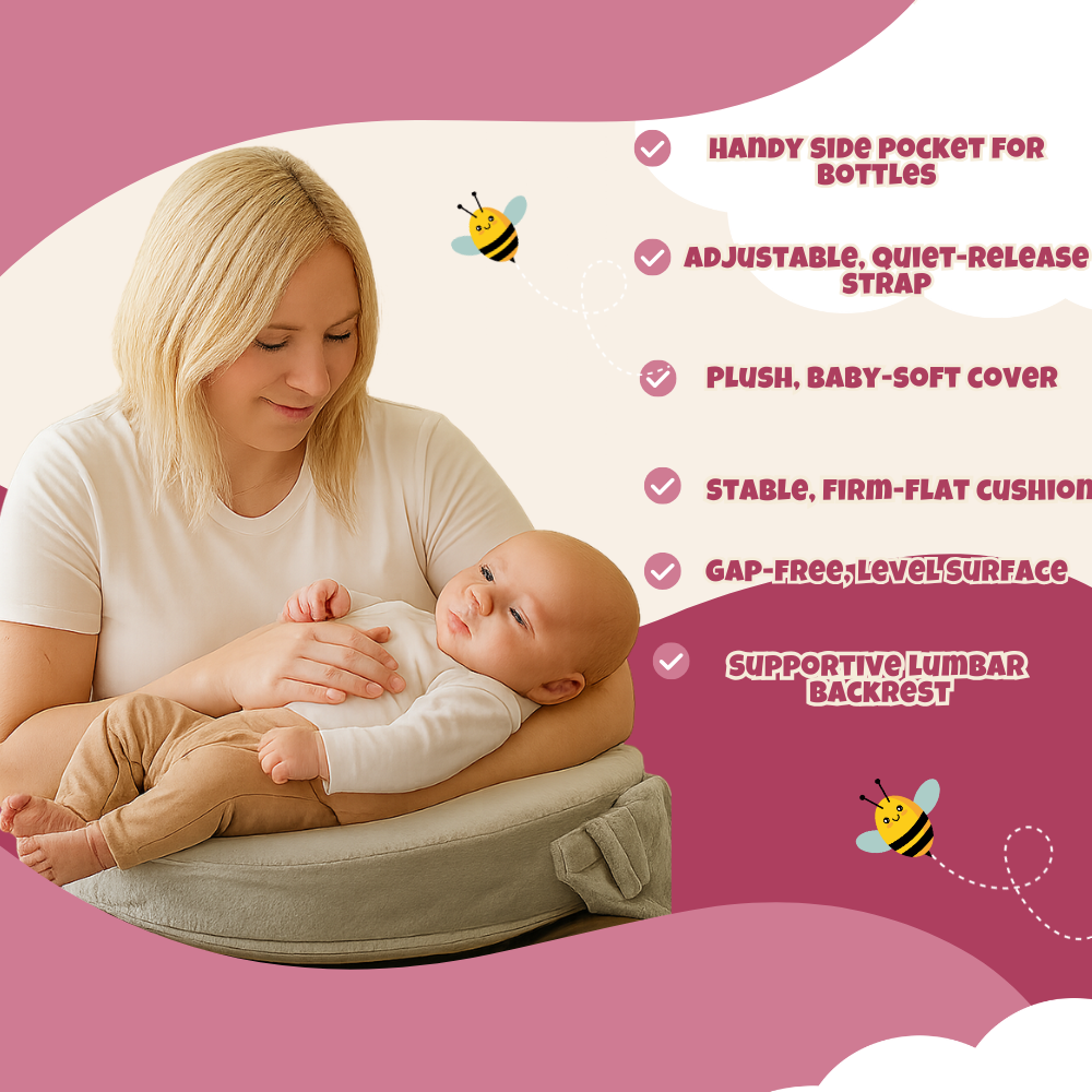 Unlike crescent or U-shaped pillows, the flat cushion removes open gaps and keeps the baby closer during feeding. The wraparound backrest supports balance and helps maintain steady positioning through longer sessions. The consistent surface minimizes the need for readjustments, keeping each session smooth and steady. Added thickness in the cushion ensures the surface stays level without sagging. The reinforced core is shaped to stay firm over time, giving reliable support through repeated use.