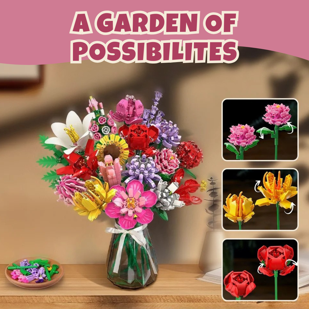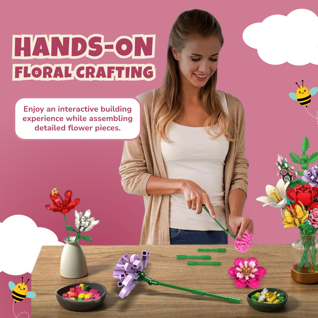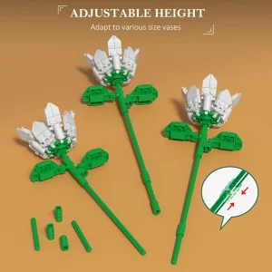 Each stem includes height-adjustable connections that allow layering and grouping. To modify structure or lean, the rods slide within hollow sleeves capped at one end. Hinged leaf parts, applied in alternating directions, expand bouquet volume without crowding the core. A labeled manual guides the builder through segmented assemblies per plant species. The build complexity increases gradually, starting with single-layer petals and ending with 3D interlock modules. Elements shaped as stamens or buds add final detailing. Spacers in the base joints maintain separation and prevent overlap between similar-color flowers.
