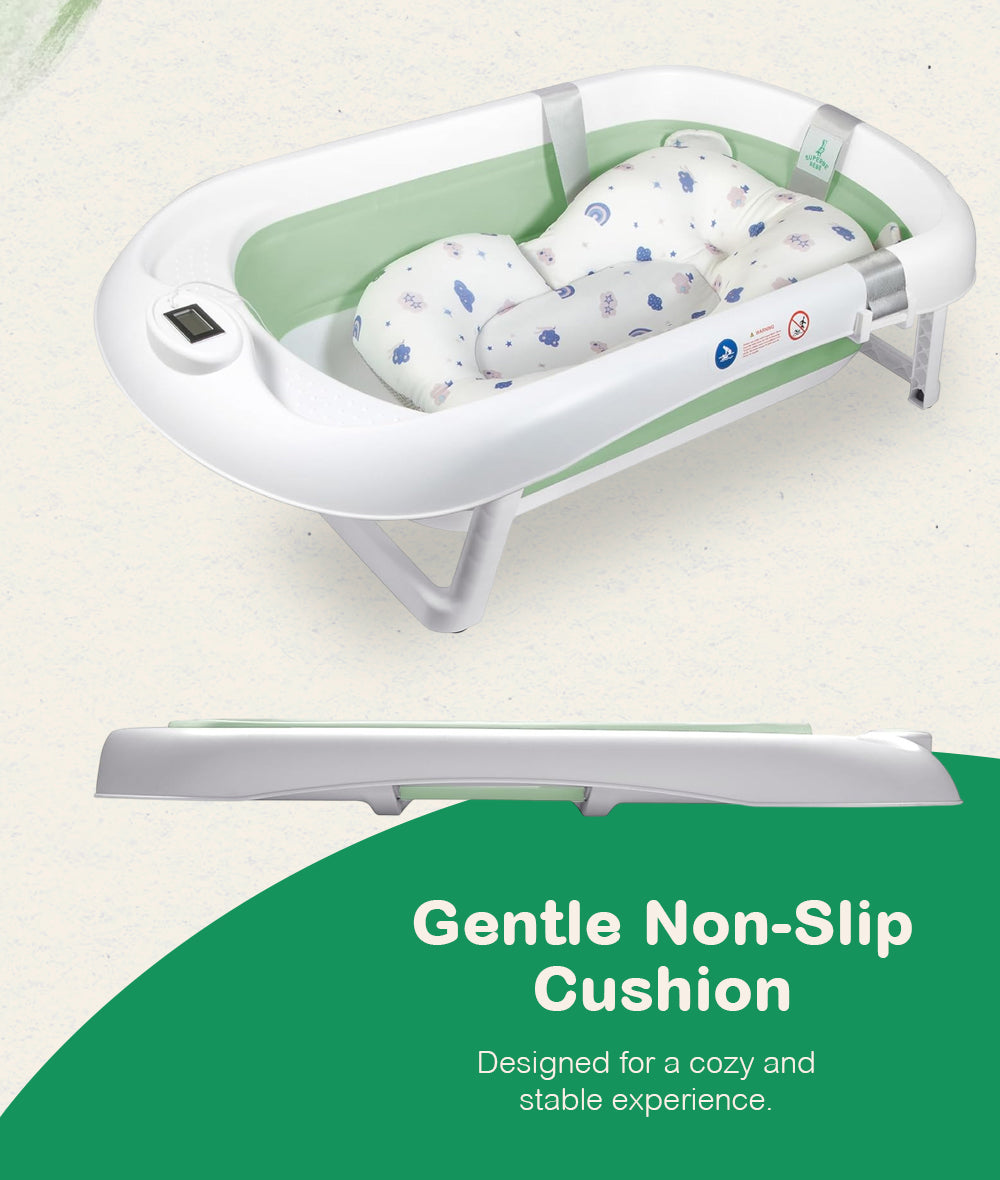 Folding down flat, this extra-large baby bathtub saves space while offering a sturdy design for daily use. The built-in water thermometer gives an accurate reading, avoiding temperature guesswork. Designed with an ergonomic cushion, the bath supports newborns and toddlers alike, preventing slipping during washes. A dedicated head rinse cup ensures gentle, soap-free pours, keeping shampoo away from delicate eyes. With a secure drainage system, emptying is quick and hassle-free. The non-slip base keeps the tub stable on various surfaces, while its durable material resists wear over time. Measuring 32.6 inches in length, this tub accommodates growing babies without feeling cramped. Whether used indoors or outdoors, this tub delivers convenience without compromise.
