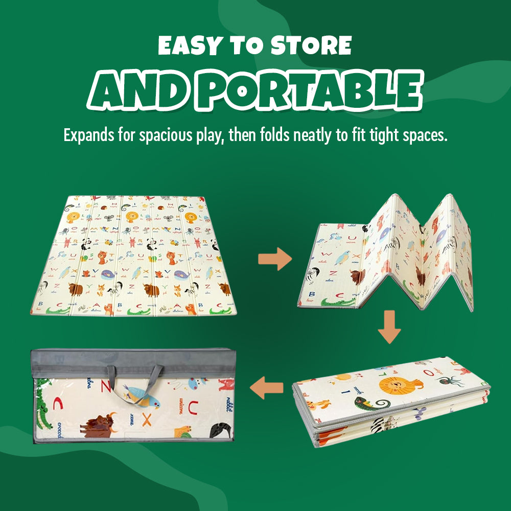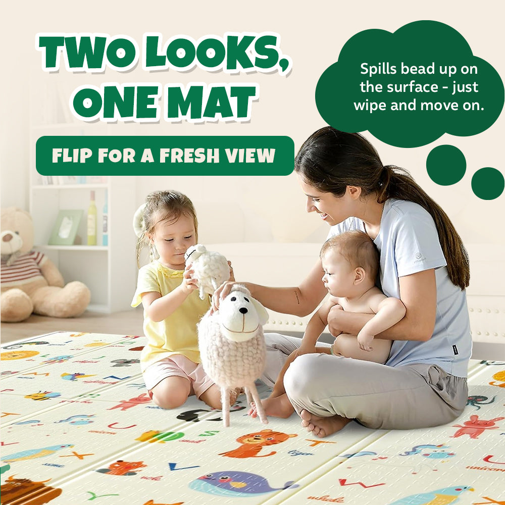 Featuring dual-sided prints, this mat brings two entirely distinct visual setups into one foldable piece. Embossed animal paths on one side promote pattern tracking while the reverse uses soft geometric shapes to support visual discrimination. Designed for long-term use, the XPE foam holds its bounce even after repeated pressure. With edges pressed into a tight seal, the surface resists water, dust, and small crumbs. Folded up, it drops to just 29 x 13 x 3.5 inches, making it compact enough to stash under beds or behind furniture. Opens to a roomy 70.8″ × 59″ with a cushy 0.4″ thickness.