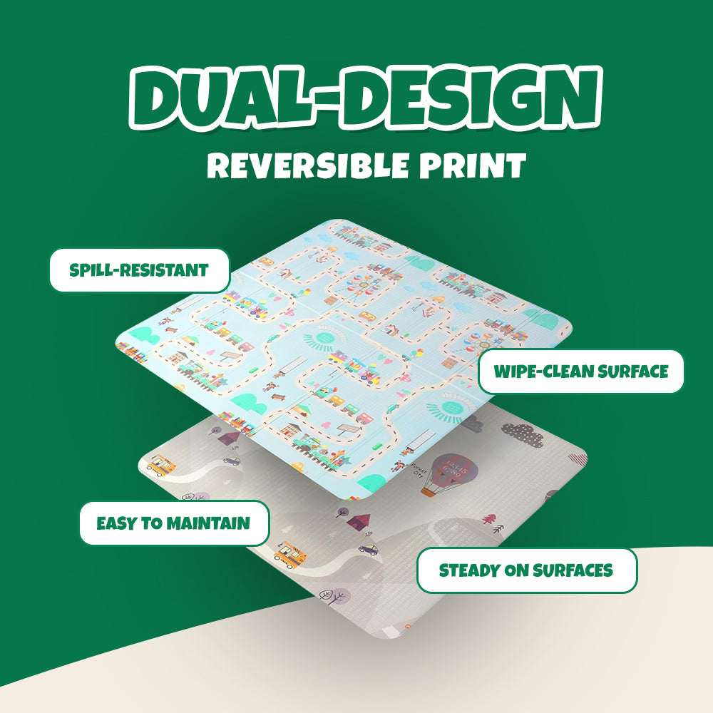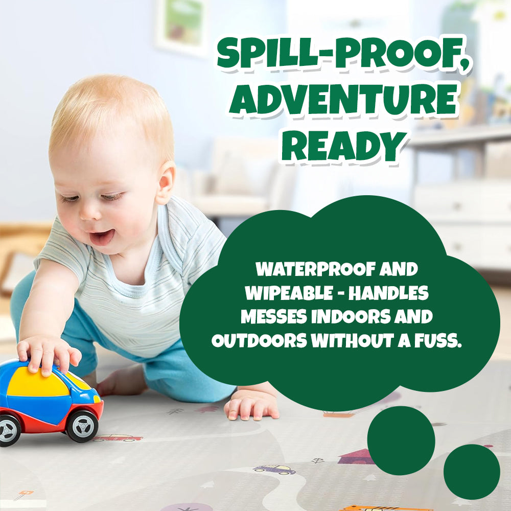 Featuring a fully reversible surface, this mat switches between a landscape of cars and mountains and a neutral textured backing suited for meals outdoors. Coated in a waterproof layer, it resists both damp grass and juice spills with equal ease. Designed to be rolled or folded, the mat stores flat or compactly in the included bag. With edges that stay flush to the floor and materials that resist tearing, this dual-use mat handles varied terrain without curling or warping. Thickness of 1 inch adds cushioning beneath crawling knees or picnic snacks.