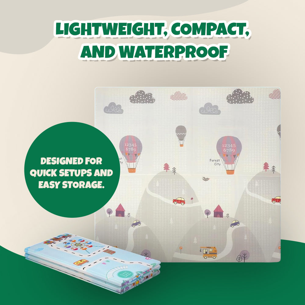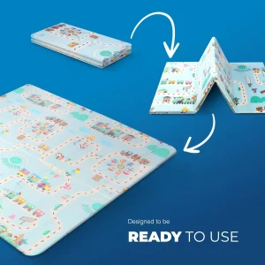 Featuring a fully reversible surface, this mat switches between a landscape of cars and mountains and a neutral textured backing suited for meals outdoors. Coated in a waterproof layer, it resists both damp grass and juice spills with equal ease. Designed to be rolled or folded, the mat stores flat or compactly in the included bag. With edges that stay flush to the floor and materials that resist tearing, this dual-use mat handles varied terrain without curling or warping. Thickness of 1 inch adds cushioning beneath crawling knees or picnic snacks.