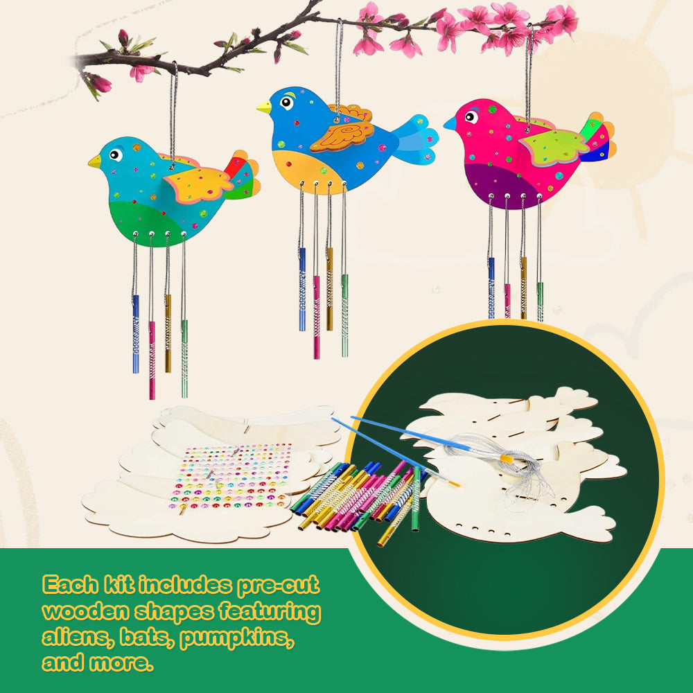 Each set features a mix of fun monster shapes with unique silhouettes. The wind chimes sway gently, creating light musical tones when moved by air. The included acrylic paints adhere well to the smooth wooden surface, ensuring vibrant, lasting color. Strong adhesive stickers replace messy glue. With multiple themes in each set, children can mix and match styles for a variety of finished projects.