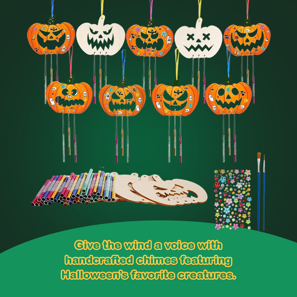 Cut, assemble, and paint your own Halloween-themed wind chimes! Each kit includes pre-cut wooden shapes featuring monsters, bats, pumpkins, and more. Lightweight wooden pieces are ready for decoration with included paints and brushes. Hanging cords and metal chimes produce a soft, eerie sound in the breeze. Designed for easy assembly, this kit lets kids 3 to 12 explore creativity without complex steps. Fully dried, the completed decorations hold up well indoors or in covered outdoor spaces.