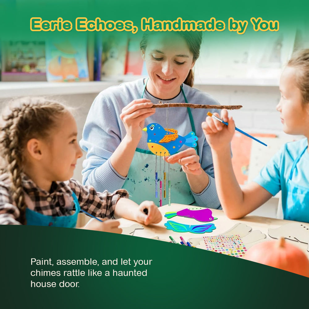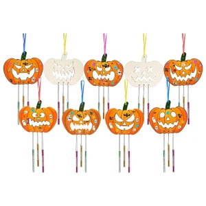 Cut, assemble, and paint your own Halloween-themed wind chimes! Each kit includes pre-cut wooden shapes featuring monsters, bats, pumpkins, and more. Lightweight wooden pieces are ready for decoration with included paints and brushes. Hanging cords and metal chimes produce a soft, eerie sound in the breeze. Designed for easy assembly, this kit lets kids 3 to 12 explore creativity without complex steps. Fully dried, the completed decorations hold up well indoors or in covered outdoor spaces.