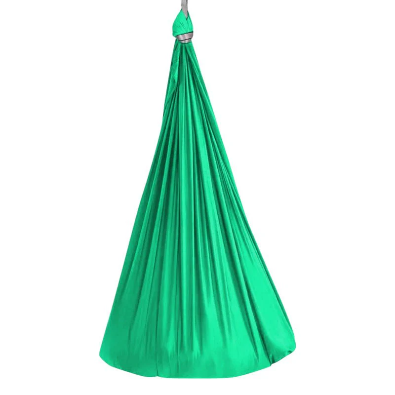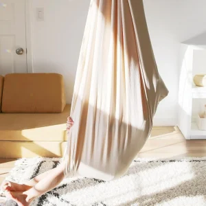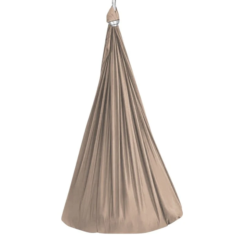 Made from a tightly woven blend of spandex and nylon, the fabric rebounds softly without sagging over time. Reinforced by triple-stitched seams, the hammock resists tearing even after repeated twisting and spinning. To maximize versatility, a 360-degree swivel connector has been included for full-range rotation without tangling. Designed to hold up to 200 lbs, its dense threading ensures full-body support. The hammock adjusts easily using a daisy chain system that adapts to different ceiling heights. At rest, the fabric compresses gently around the body, maintaining shape without rigid edges.