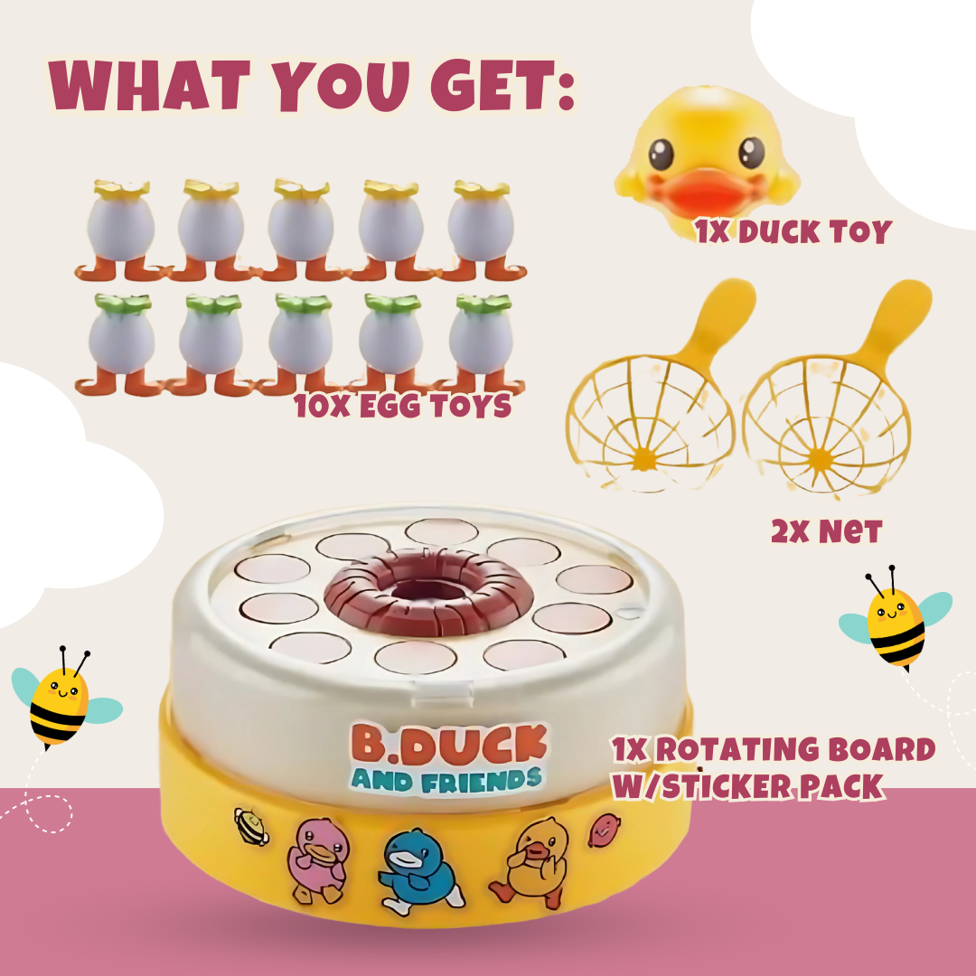 Popping out from the spinning board, 10 egg-shaped toys bounce upward as the base rotates around the center duck. Installed with a concealed motor, the platform pushes the eggs up randomly, inviting fast reaction from players. Children use handheld nets to catch the bouncing eggs before they land. The playset runs on three AA batteries, secured underneath the shell. Each game round resets easily, with the eggs placed back into their slots around the board.