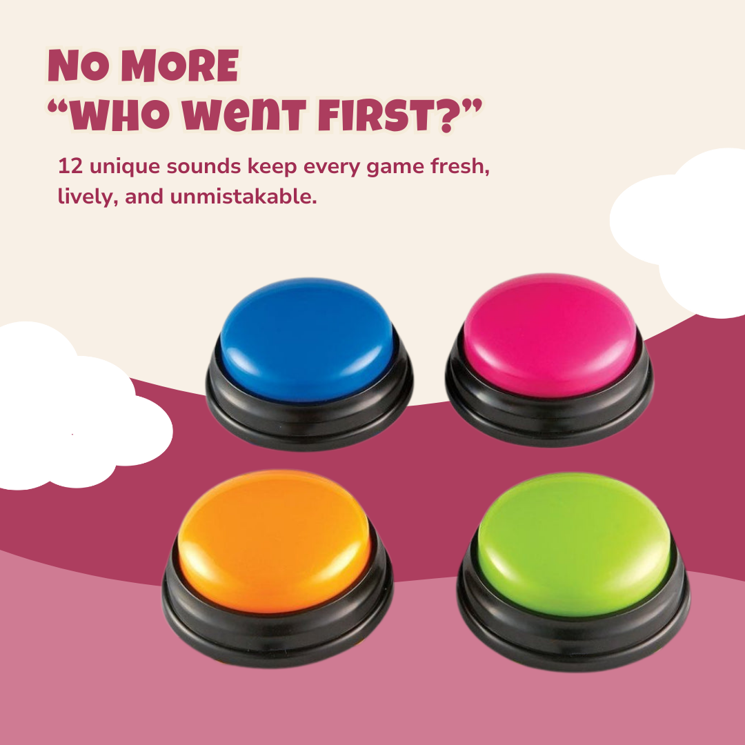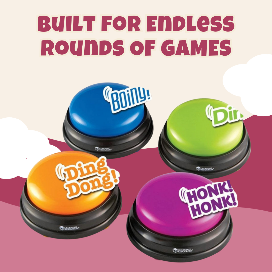 Measuring 3.5 inches in diameter, these buzzers fit perfectly in small hands while remaining sturdy enough for repeated classroom use. Each of the four buttons triggers a distinct sound: a honking horn, a boxing bell, a doorbell, and a boing spring. Designed for rapid responses, the buzzers activate with a light press, reducing the need for forceful tapping. Two AAA batteries (not included) power each unit, ensuring consistent sound quality. Bright colors help users quickly differentiate between buzzers. Crafted for interactive play, they function instantly out of the box without requiring setup. The sounds are loud enough for group activities yet balanced to avoid overwhelming the room.