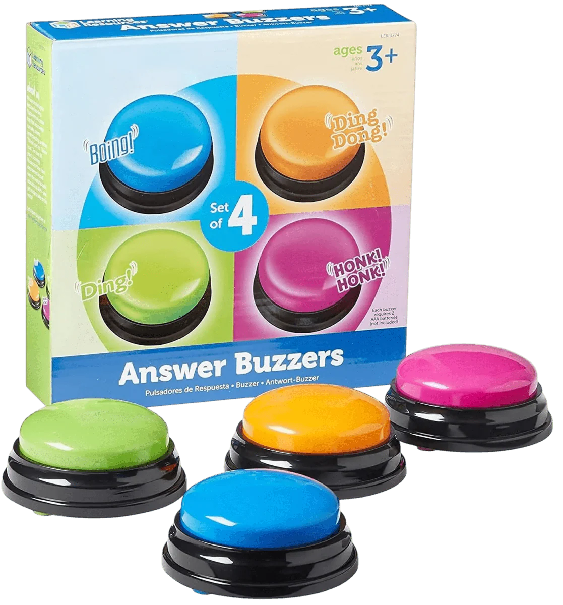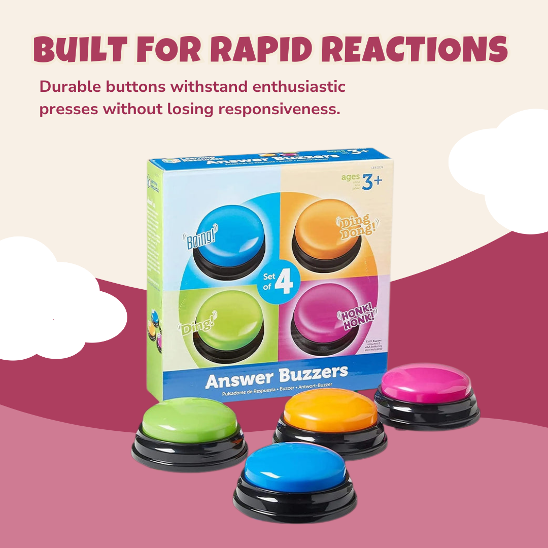 Measuring 3.5 inches in diameter, these buzzers fit perfectly in small hands while remaining sturdy enough for repeated classroom use. Each of the four buttons triggers a distinct sound: a honking horn, a boxing bell, a doorbell, and a boing spring. Designed for rapid responses, the buzzers activate with a light press, reducing the need for forceful tapping. Two AAA batteries (not included) power each unit, ensuring consistent sound quality. Bright colors help users quickly differentiate between buzzers. Crafted for interactive play, they function instantly out of the box without requiring setup. The sounds are loud enough for group activities yet balanced to avoid overwhelming the room.