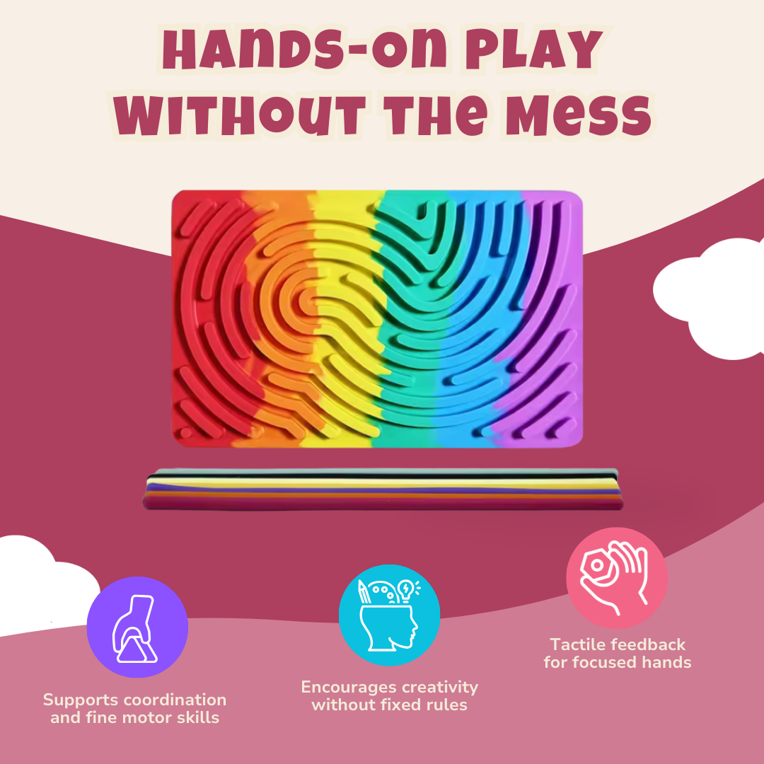 The board measures 6.74 x 4.25 in and includes 10 flexible silicone strips that twist, curl, and lock into grooved tracks. Strips adhere to the textured surface without snapping loose, allowing repeated tracing, twirling, and layering. Kids can rotate and overlap each piece to create flowing paths or coiled forms. No tools, no clicks, just pure finger movement. The board stays firm on a flat surface while offering enough give for little hands to press comfortably.