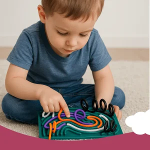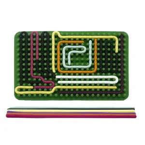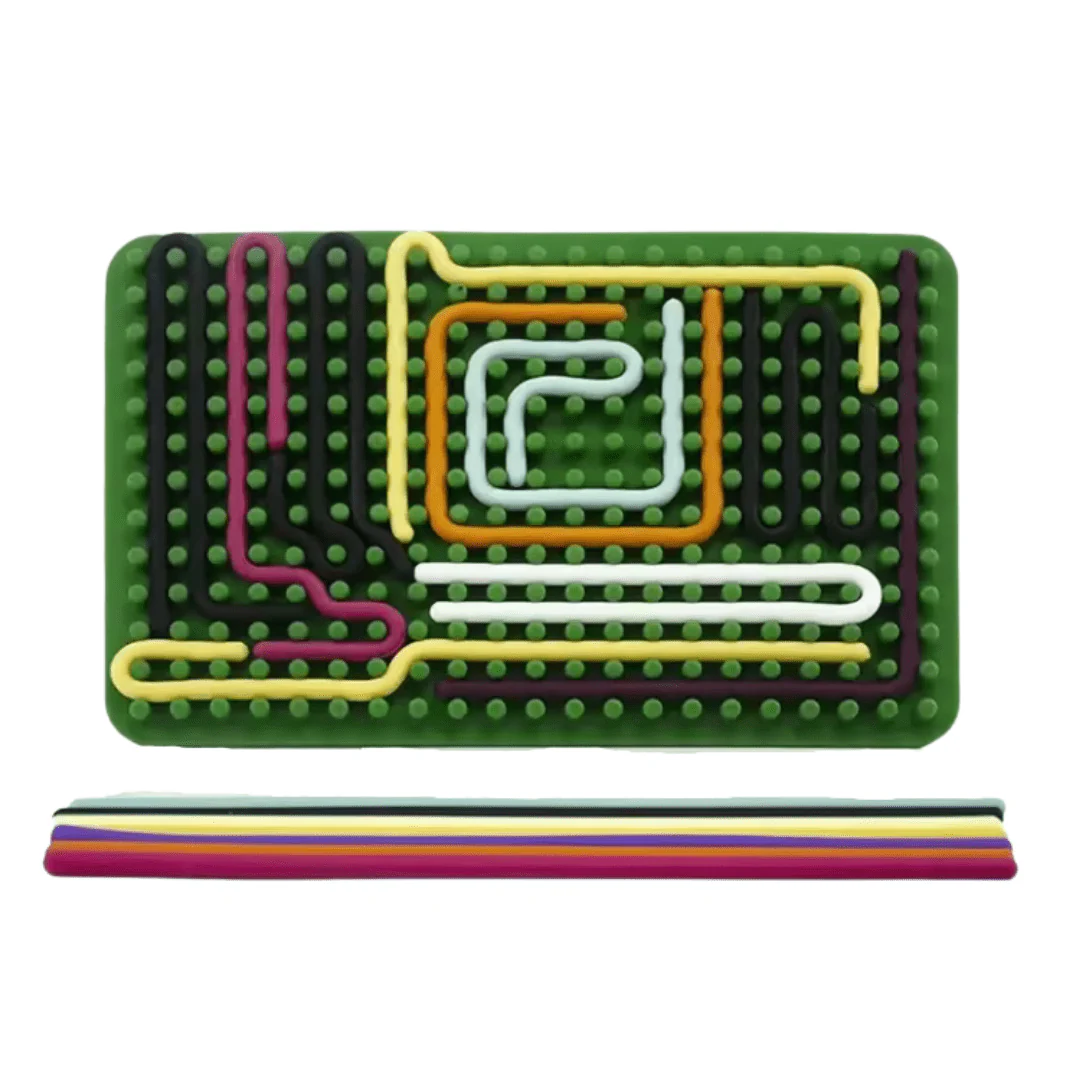 Whether used to calm fidgety hands, fill waiting time, or inspire design play, this board invites motion over noise. It supports dexterity and planning without pressure, there’s no wrong way to loop or line the strips. The silicone threads resist tearing and can be shaped over and over without losing tension. Used flat or angled, indoors or out, it builds habits of exploration through a simple, repeatable motion. Parents appreciate how easily it resets, kids keep coming back to try it differently each time.