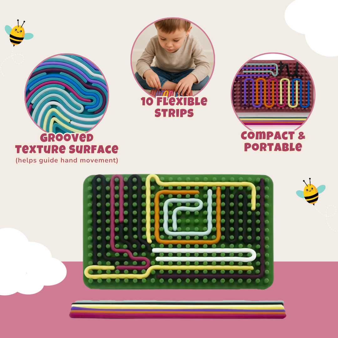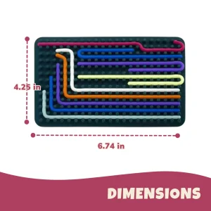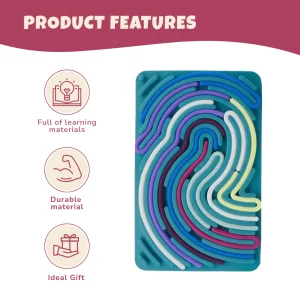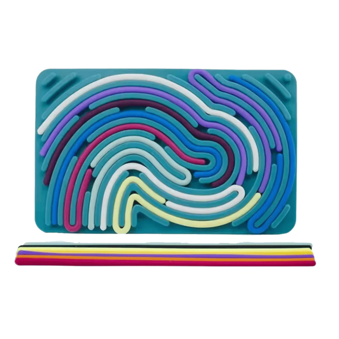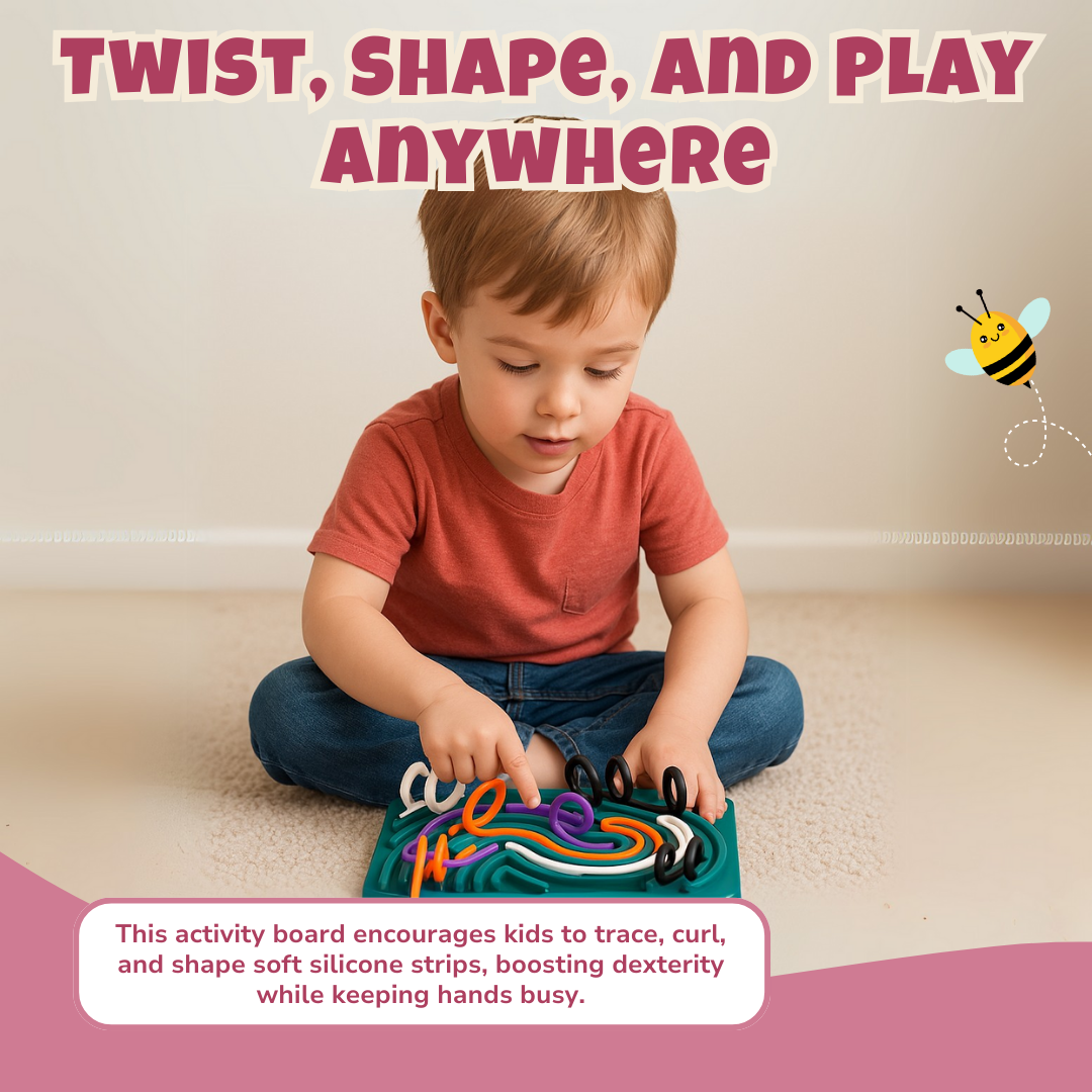 The board measures 6.74 x 4.25 in and includes 10 flexible silicone strips that twist, curl, and lock into grooved tracks. Strips adhere to the textured surface without snapping loose, allowing repeated tracing, twirling, and layering. Kids can rotate and overlap each piece to create flowing paths or coiled forms. No tools, no clicks, just pure finger movement. The board stays firm on a flat surface while offering enough give for little hands to press comfortably.