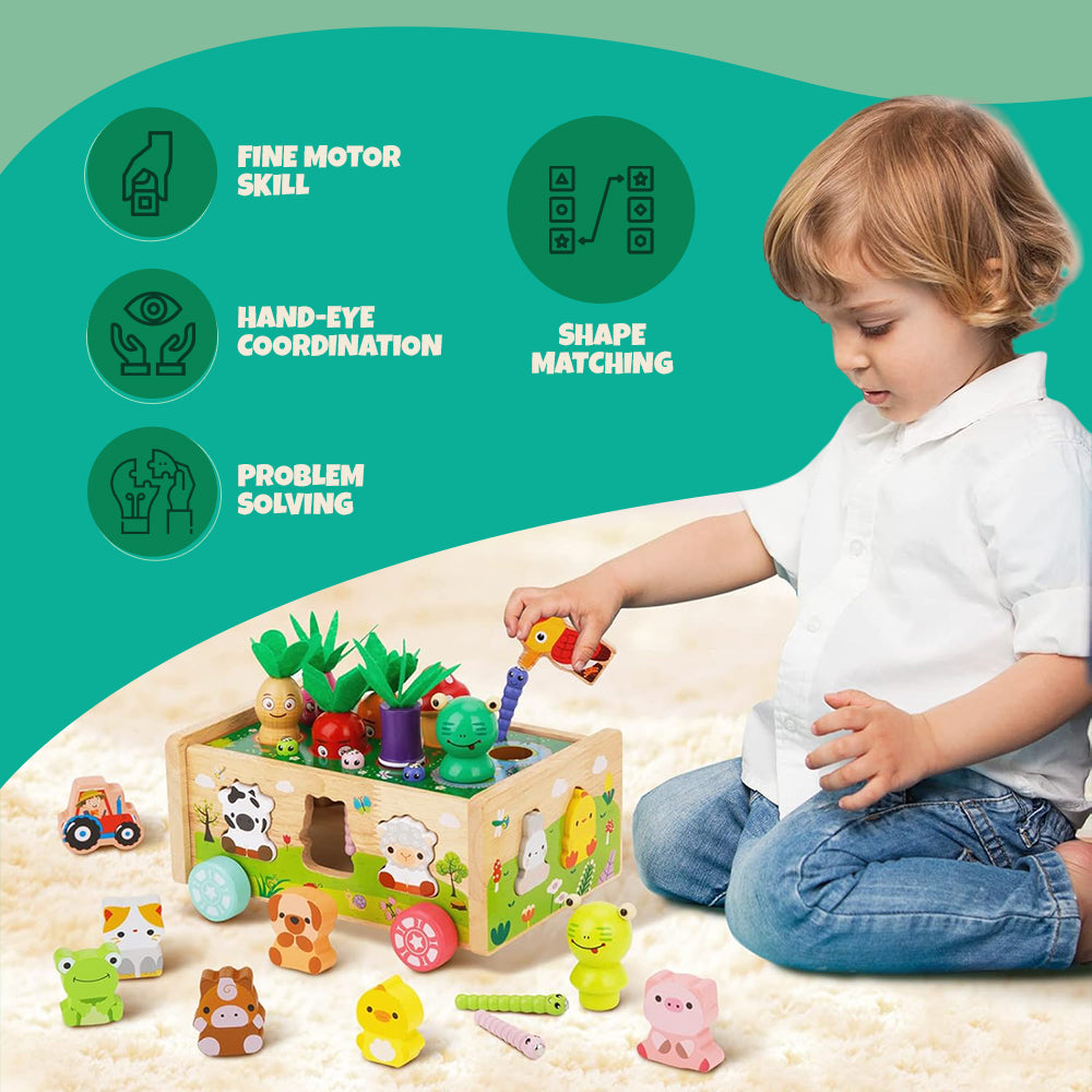 Sorting carrots by size builds logical sequencing, and pulling them out requires wrist rotation that stimulates motor coordination. Designed for repetition, this activity builds pattern recognition in stages through shape variation and animal pairing. For classrooms and households, this compact setup reduces clutter with built-in storage, keeping everything contained. By combining stacking, matching, and grabbing in one set, this toy eliminates the need for multiple playsets. Through simplicity in form, it addresses a common need: combining skill practice with self-guided engagement.