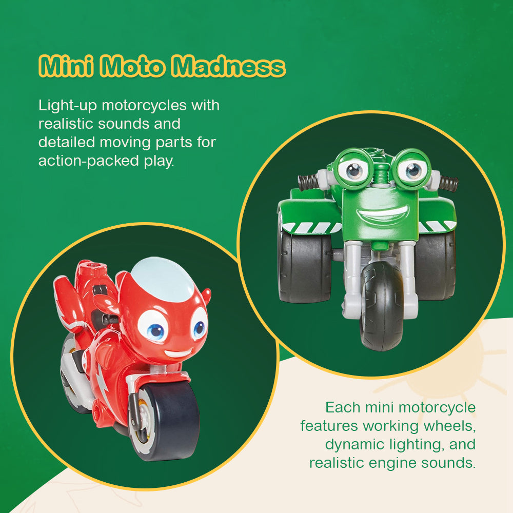 Bright LEDs illuminate as the motorcycles accelerate, adding visual impact to every stunt. Equipped with a responsive remote control, Ricky Turbo zips through twists and turns with ease. Loop launchers propel bikes at thrilling speeds, ensuring dynamic movement across the playsets. The detachable rescue trailer doubles as an interactive station, offering multiple play modes. Playset components seamlessly connect, allowing for endless track variations. Each feature contributes to a seamless blend of action, interactivity, and customization.