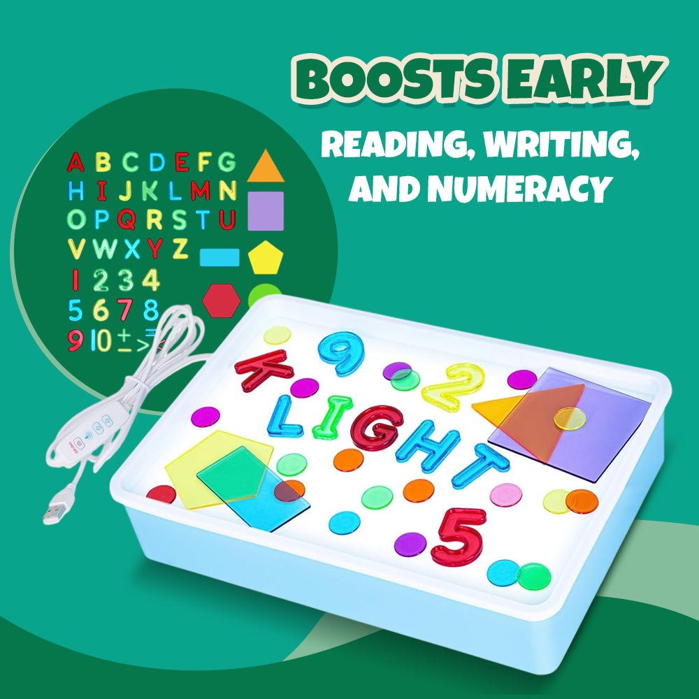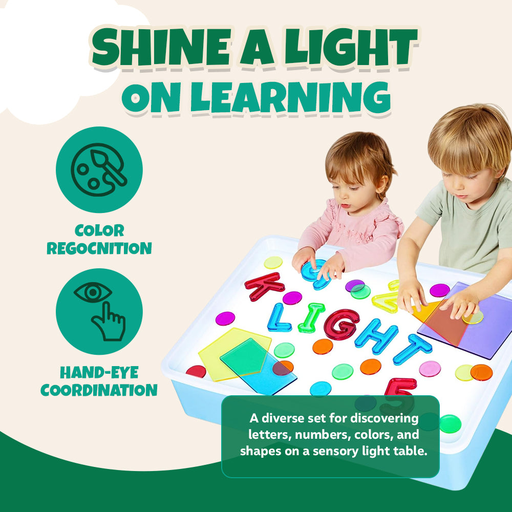 Packed with 148 engaging pieces, this set transforms any light table into an interactive learning hub. Transparent letters, numbers, and shapes allow kids to explore color mixing, pattern recognition, and letter formation in a hands-on way. Designed for compatibility, the pieces work seamlessly with standard light tables. Featuring bold, easy-to-handle components, the set encourages fine motor skill development. The variety of pieces ensures endless possibilities, from spelling out words to constructing vibrant patterns. Lightweight yet sturdy, each piece resists bending and warping, keeping them functional over time. Built for young learners, the set promotes early literacy and numeracy in a uniquely visual format. With every illuminated shape and letter, children engage in structured play that stimulates cognitive growth.