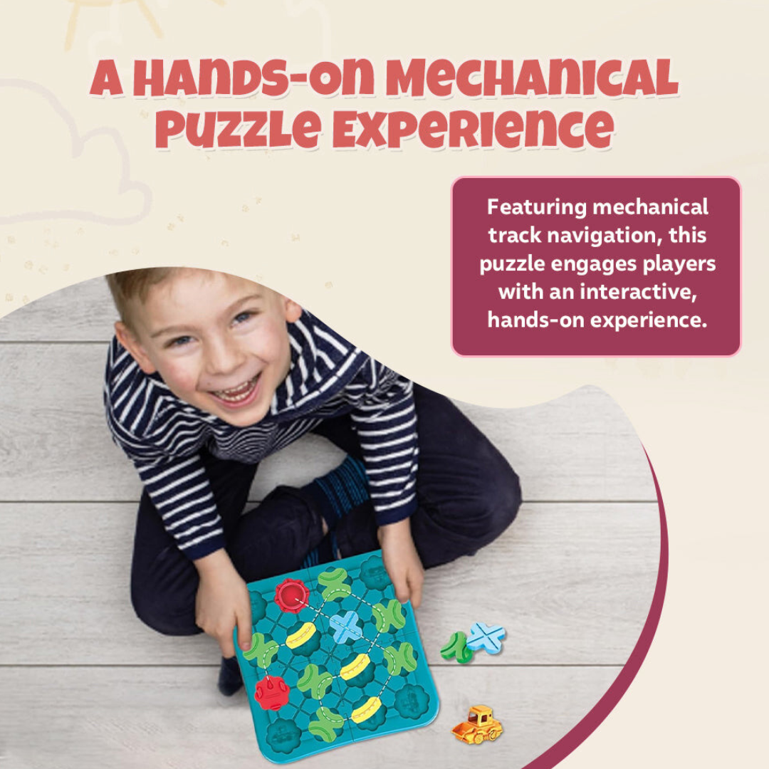 Rotating mechanical switches control direction changes throughout the path. Designed for fine-motor development, the switches require wrist control rather than brute force. Each puzzle scenario introduces a new rule variation, keeping repetition low and discovery high. To prevent skipped steps, progress-dependent gates block shortcuts until all previous track logic has been completed. A set of mini flags accompanies the puzzle to mark completed levels. Challenge cards, which display overhead views, train spatial recognition using simplified symbols that reinforce left-right orientation.