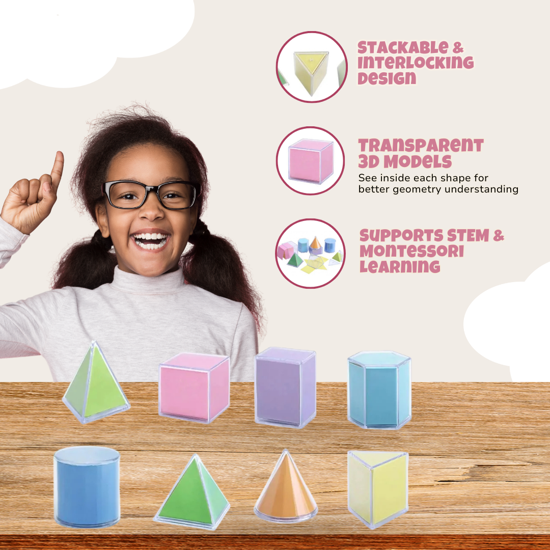 Designed for hands-on learning, these eight transparent 3D geometric solids bring mathematical concepts to life. The set includes cubes, pyramids, and spheres, each made from durable plastic with smooth edges. With clearly defined vertices and faces, they allow students to explore volume, symmetry, and spatial reasoning. Filling them with liquids or solids reveals a real-world application of measurements. These models work perfectly with Montessori and STEM activities, ensuring an interactive approach to geometry lessons.