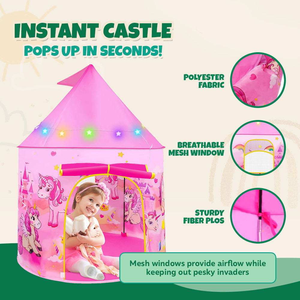 Designed for easy setup, this pop-up unicorn tent unfolds in seconds, eliminating the hassle of complicated assembly. A durable fiberglass frame keeps it lightweight yet sturdy, making it suitable for both indoor and outdoor adventures. The breathable mesh windows allow proper airflow, while the roll-up door provides easy access. Featuring a vibrant unicorn print, the tent’s fabric resists wear and tear, ensuring long-term use. At 47″ H with a 39″ × 39″ base, this pink playhouse pops up fast for fun anywhere.